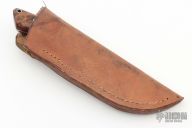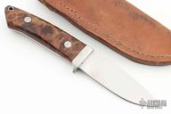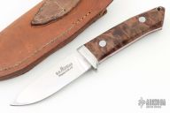 This Hunter from Richard A. Rotella features a mirror polished drop point blade with .170" blade stock and 1.116" blade depth, full tapered tang construction. The handle is comprised of a stainless steel guard and stabilized maple burl scales over red liners. Lanyard tube in pommel. Includes leather sheath with belt loop. Comes with COA dated May 10, 2023 and #98. New from maker.