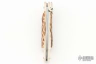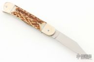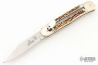 This Lever Lock Automatic by Hubertus Knives features a polished clip point blade. The handle is comprised of nickel silver double bolster and lever with stag scales over brass liners and steel backspacer. Comes with original box. Has some light scratches and patina, otherwise excellent condition.