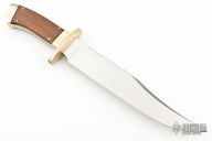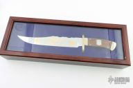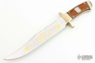 This bowie from Colt features mirror polished clip point blade with file worked spine and false top edge, .237" blade stock and 1.648" blade depth, hidden/frame tang construction. The handle has a brass guard and frame with checkered walnut scales over black liners. Has a little patina and a couple light scratches, otherwise excellent condition. Includes a wooden presentation box.