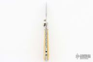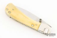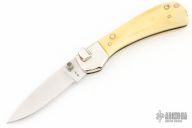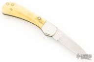 This knife by Jerry Stone features a satin finished blade with nickel silver thumbstud. The handle has nickel silver dovetailed bolsters, mammoth ivory covers, nickel silver liners and a fileworked stainless steel backspacer. Has a few light scratches, otherwise good condition.