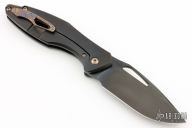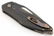 This Arius Non-Flipper by Koenig knives features a black blade with thumbhole. The handle has a black titanium frame with anodized titanium backspacer and Zircuti tip up clip with hidden screws. Has ceramic bearings and a ceramic detent ball. Nice detent, lockup and blade seating. Appears to have been modified. Comes with original box. Excellent condition.