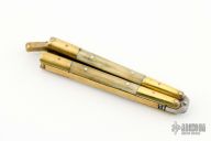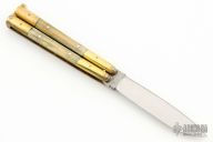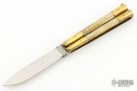 This balisong from the Philippines features a satin finished blade. The handle has brass bolsters and channel/liners, jigged bone scales, brass T-latch. Has a couple light scratches and patina, otherwise excellent condition.