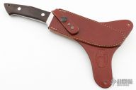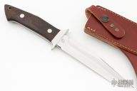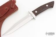 This Loveless Style Fighter by Deon Nel features a mirror finished blade with sharpened top edge, .188" blade stock and 1.108" blade depth, full tapered tang construction. The handle has stainless steel guard, wood scales with red liners and stainless steel pins. Comes with a brown leather sheath and a zippered case. Excellent condition.