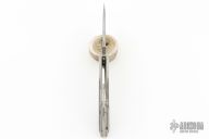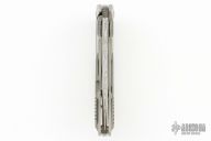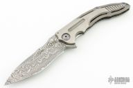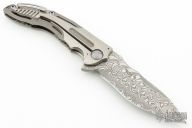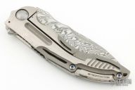 The Avenger by Flavio Ikoma features a Damascus blade with notched thumbrest and flipper. The handle has a textured titanium frame, a floating Damscus backspacer, tip up carved titanium clip. Interior of frame is jeweled. Rides on IKBS, nice detent, lockup and blade seating. Excellent condition. Comes with a zippered case.