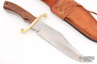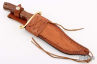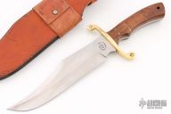 This Bowie from Colt Knives features satin finished blade with Colt logo on presentation side, .183" blade stock and 1.791" blade depth, full tang construction. The handle has a brass guard with wood scales and brass spacers, lanyard hole in pommel. Comes with a brown leather sheath. Has some light scratches and patina, otherwise good condition.