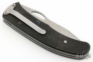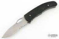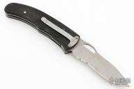 "The Lobo automatic is a double-action automatic knife that can function as a one handed opening locking-liner knife or be instantly fired in the automatic mode. The Lobo has a 3.5 inch blade to handle any cutting chore and a convenient stainless steel pocket clip. The automatic firing mechanism is hidden under the handle and is activated by sliding the left side handle scale towards the top of the knife. Because there are no apparent buttons on the outside of the handle the fact that the Lobo is an automatic is known only to its owner. This makes the Lobo convenient to carry and use anywhere." This Lobo features a bead blasted serrated blade, and G10 scales. Has some scuffs and scratches, good condition otherwise.
