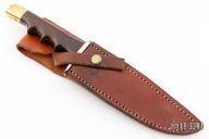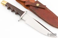 This fighter by Jim Smith feautres a mirror polished blade with a nearly sharpened top edge, .245" blade stock and 1.474" blade depth, hidden tang construction. The handle has a stainless steel guard, brass butt, brown canvas micarta grip with finger grooves and red liners. Comes with a brown leather sheath. Has some light scratches, otherwise excellent condition.