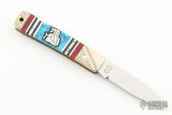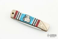 This knife by AG Russell was Customized by Ron Yellowhorse is a lock back with nickel silver bolsters, turquoise, jasper and nickel silver spacers, brass liners. Mirror polished blade. Strong lock up. Excellent condition. Comes with original box. #1 of 50.