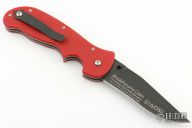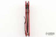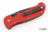 This Pat Crawford designed Carnivore from R.E.K.A.T features a black blade with dual thumbstuds. The handle has red G-10 scales, stainless steel liners, tip up pocket clip. S/N 016/050. Has some light scuffs, otherwise good condition.