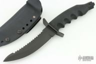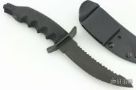 This Hobbit Warrior by REKAT features a black .159" blade stock. 1.190" blade depth. Serrated top edge. Double guard. Rubber handle. Black coated butt cap. Some scuffing on the butt cap. Comes with kydex sheath with belt loop. Light sheathing scuffs are visible on the blade otherwise the knife is in excellent condition.