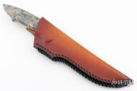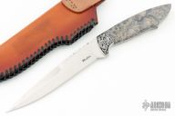 Visit this maker's website: Moulton Knives. "I started making Custom Knives as a Full-Time maker/designer in 1991. I currently use CPM-154CM, a VERY new Version of the standard 154CM steel. It is a very clean powdered version of the standard 154CM,still in its primary developmental stage. I am one of very few knifemakers that have access to this steel, until it is through the development & analysis process. I also occasionally use the standard ATS-34. I also use Damascus steel forged by some of my friends, in my creations.All of my knives are made freehand. That is, I do not incorporate the use of mills, lathes, surface grinders, etc....in my shop, there are just a couple of basic belt grinders, disc grinders, a drill press and a band saw. (I feel that as long as I can make a modest living building knives with a minimum of mechanical assistance, relying instead on my own hand craftsmanship then that is the way I prefer it). And I hope that this manner of making knives will in the long run give my knives a better value when I am long gone. I strive, above all, to build a high quality product that the discriminating buyer will be proud to own. All knives are created by stock removal and are hollow ground, most all of them having tapered tangs and dovetailed bolsters. Then, with each piece I create, I offer a personal satisfaction guarantee because I stand behind my work and it's underlying quality is paramount.I strive to create designs that are unique in the custom knife market. I want people to know when they see one of my knives in a collection, "that's a Moulton"! For me, this is the ultimate satisfaction I get from this work."
