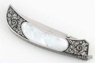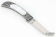 This Linerlock from Ralph Dewey Harris features a hand rub satin finished upswept blade with dual thumb studs with pearl inlays. The handle is comprised of an engraved frame with mother of pearl inlays over file worked backspacer. Excellent condition