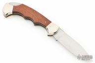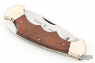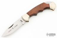 This lockback by Fulcraft features a satin finished blade with nail nick. The handle has nickel silver bolsters, dymondwood scales, brass liners, steel backspacer. Has some scratches and a couple nicks in the blade edge, otherwise good condition.