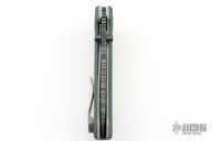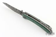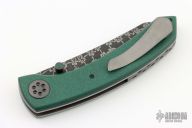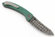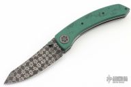 This Model 9 by Rainy Day Knives features a Chainmail Mosaic Damascus blade with notched thumbrest and dual zirconium thumbstuds with Vintage Emerald Paper Micarta inlays. The handle has vintage Emerald Paper micarta scales, orange peel finished titanium liners, zirconium pivot and fileworked backspacer, tip up titanium clip with hidden screws. Nice detent, lockup and blade seating. Comes with zippered case, spanner wrench and COA. New from maker at the 2024 Blade Show Texas.