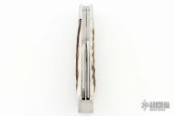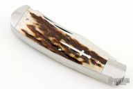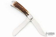 This Trapper by Kabisch Custom Knives features hand rub satin finished blades with nail nicks. The handle has stainless steel bolsters and liners, stag covers with stainless steel sword escutcheon, stainless steel springs. Has half stop, flush in all positions. Comes with a zippered case. New from maker at the 2024 Blade Show Texas.