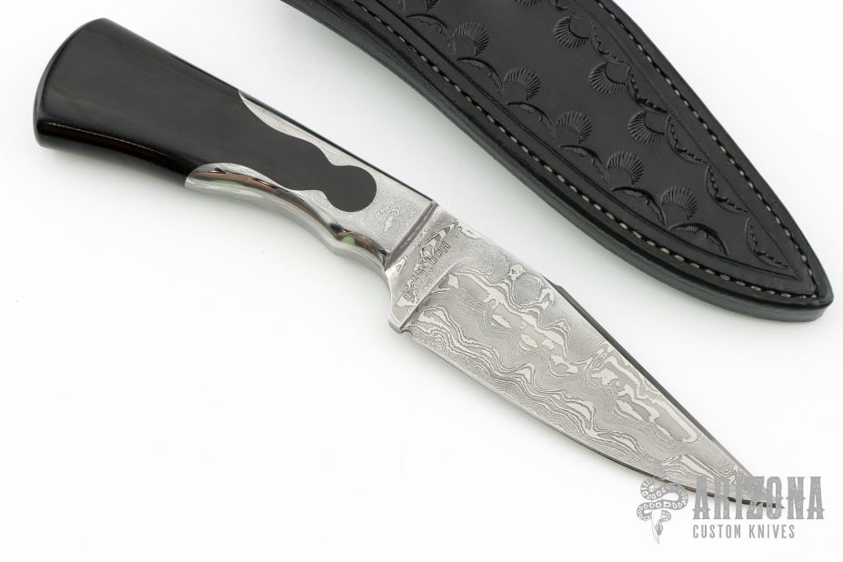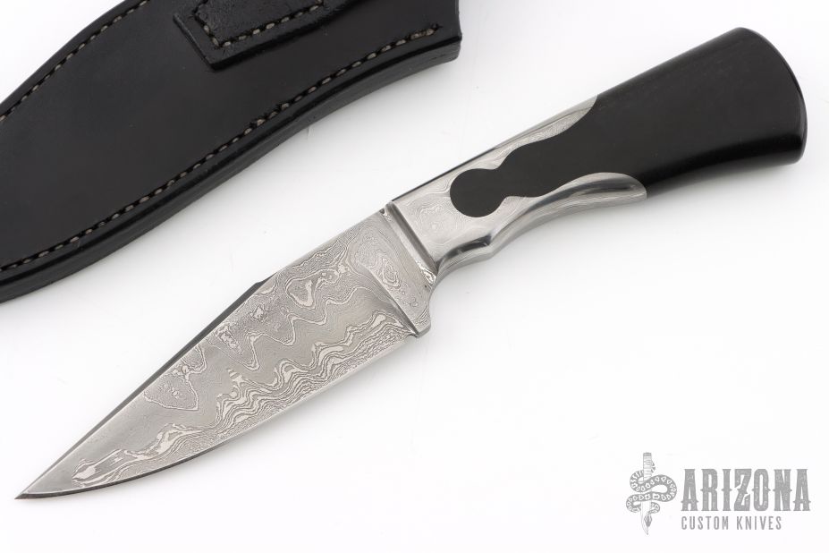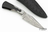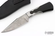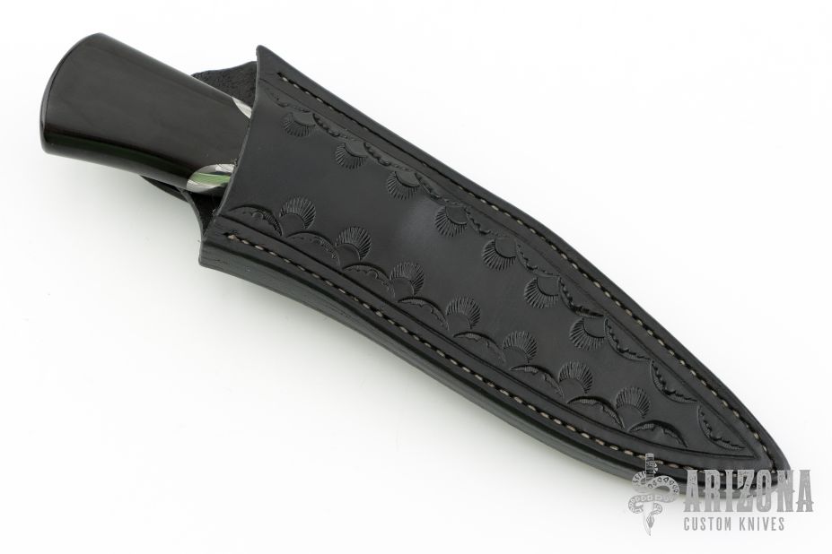 This Integral Keyhole Hunter by Hogtooth Knives features a Damascus blade with false top edge, .158" blade stock and 1.311" blade depth, integral keyhole construction with black linen micarta grip. Comes with a hand tooled black leather sheath. New from maker at the 2024 Blade Show Texas.