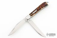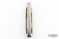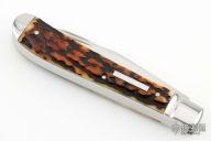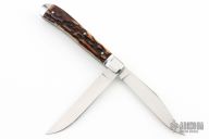 This Dogleg Trapper from Mr. Ohta features two hand rub satin finished blades with nail nicks. The handle has fluted stainless steel bolsters, stag covers with stainless steel escutcheon, stainless steel liners and springs that are flush in the closed, half-stop, and open positions. Has a few light scratches, otherwise excellent condition.