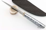 I have been making knives for over 28 years. I make my own Damascus, everything from random patterned to pattern-welded mosaic in my blacksmith shop in Warsaw, Missouri. I make all sorts of knives including hunters, small and large to small swords. I use 1084, 1095 spring steel, 15n20, and L6 tool steel in my Damascus. I prefer to use sambar stag and fossil ivories on the handles with nickel silver for the fixtures.