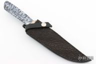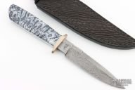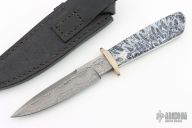 This fighter by William Miller features a spear point Damascus blade with false top edge and fileworked spine, .254" blade stock and 1.045" blade depth, hidden/frame tang construction. The handle has a nickel silver guard, stainless steel frame, and coral scales. Comes with a black leather sheath. Excellent condition.