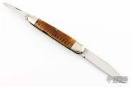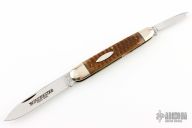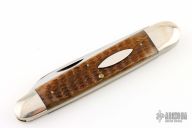 This knife by Case and Winchester features polished blades with nail nicks. The handle has nickle silver bolsters and cap, jigged bone covers, brass liners and stainless steel springs. Comes with original box. Has some light scratches and a small nick in the blade edge, otherwise excellent condition. Dated 1990