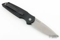 This TR-3 by Pro-Tech Knives features stonewashed magnacut spear point blade. The handle has a black milled aluminum frame with a black steel pocket clip.  Includes the original box and papers. Comes with Schmuckatelli Protech Skull Bead. Has some light scuffs and some wear on the corner of the frame, otherwise good condition.