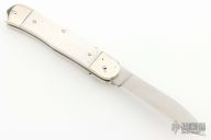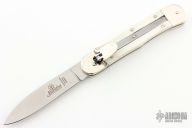 This leverlock auto by Hubertus features a mirror polished blade, nickel silver double bolsters, white bone scales, nickel silver liners and brass pins. Opens with a nice snap. Very fast opening. Comes with original box and papers. New condition.