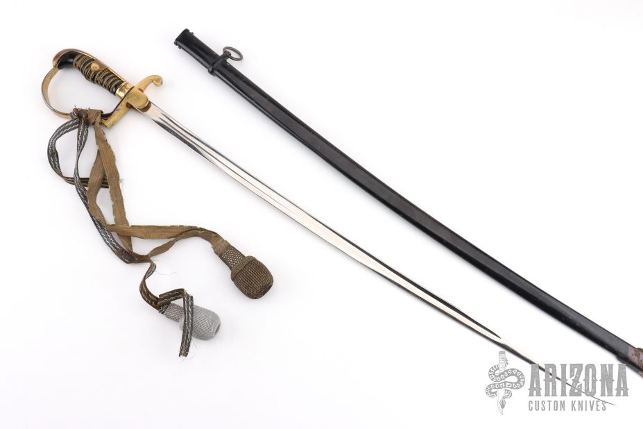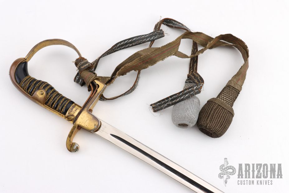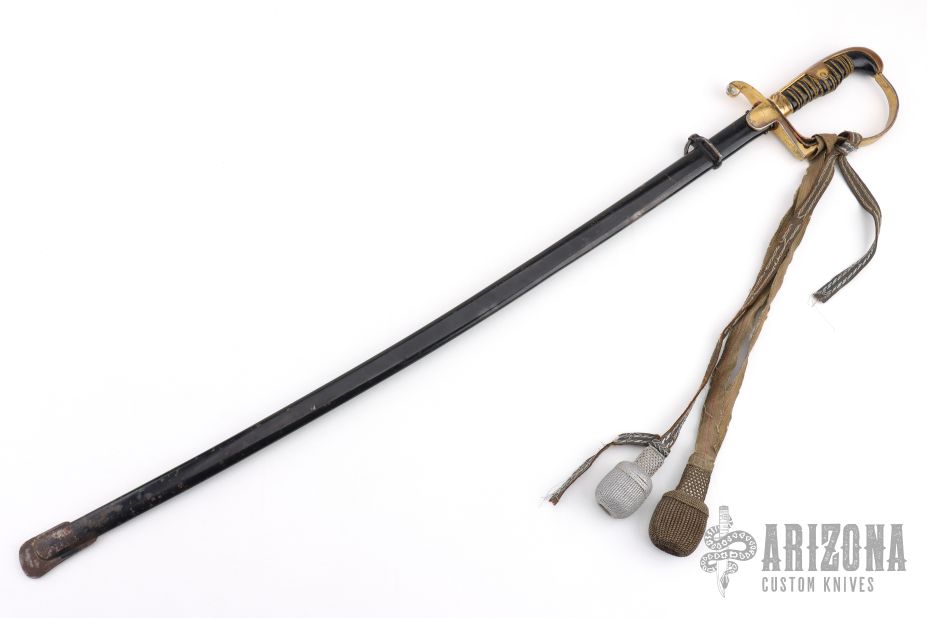 Comes with original scabbard. Some of the wire on the handle has loosened. Has patina, and scuffs and scratches, good condition otherwise.