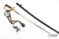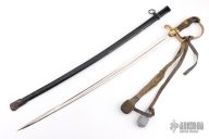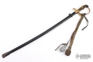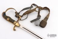 Having 27-inch blade with Carl Eickhorn “seated squirrel” mark on ricasso, gilt brass hilt retaining leather buffer pad, backstrap and pommel with wire-wrapped grip; scabbard having black finish and single suspension ring.