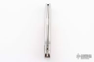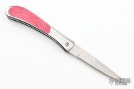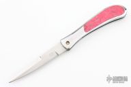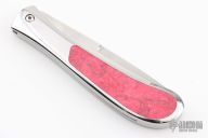 This Interframe Scale Release Auto from Chuck Stewart features a drop point hand rub satin finished blade with false top edge. The handle has a stainless steel frame with pink stone inlays. Knife opens and closes using the Stewart Lock Release system. It is a little tough to fire, but functions fine, has some light scratches, otherwise good condition.