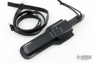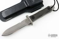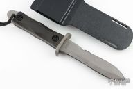 This Dive Knife by EK Knives features a bead blasted blade with serrated top edge, .236" blade stock and 1.059" blade depth, full tang construction. The handle has a stainless steel guard with rubber scales. Comes with a kydex sheath with leg straps and original box. Has a few scuffs, otherwise excellent condition. Rare.