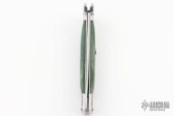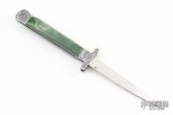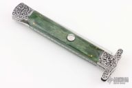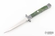 This Auto by Agasi Hambartsumian of Armenian Doctor Knives features a satin polished blade. The handle has engraved stainless steel bolsters, stainless steel liners, green bone scales with brass pins, fileworked stainless steel backspacer. New from maker. Comes with a hand tooled brown leather sheath. This one has a little side to side blade play.