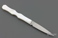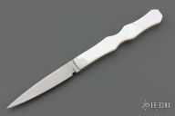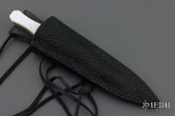 This neck knife by Howard Viele features a drop point blade with .113" blade stock and .381" blade depth, full tapered tang construction. The handle has mother or pearl scales. Comes with a black leather stingray skin sheath. Has a couple light scuffs, excellent condition otherwise.