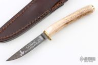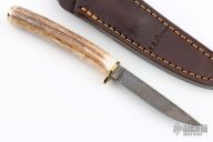 This Bird and Trout by LL Bean features a Damascus blade with .099" blade stock and .477" blade depth, hidden tang construction. The handle has a brass guard and butt with stag grip. Comes with original presentation box with brown leather sheath inside. Excellent condition.