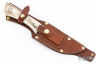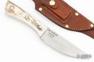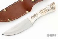 This fixed blade by RJ Smith features a satin finished blade with .185" blade thickness and 1.544" blade depth, full tang construction. The handle has stag scales. Comes with a brown leather belt sheath. Has some scratches, good condition otherwise.