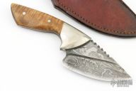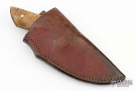 This knife by Chris Peterson features a Damascus blade with visible temper line, fileworked spine, .276" blade stock and 2.361" blade depth, full tapered tang construction. The handle has nickel silver bolsters, curly maple scales with red liners. Comes with a brown leather sheath. Has some patina and light scratches, otherwise excellent condition.