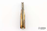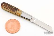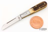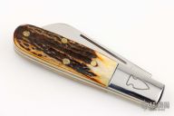 This Barlow from Northwoods Knives features a satin finished blade with nail nick. The handle has stainless steel bolsters, stag covers, brass liners and stainless steel spring. Has half-stop. Has a few light scratches, otherwise excellent condition. Comes with a leather slip sheath and a challenge coin.