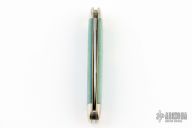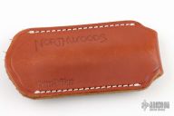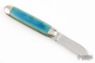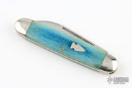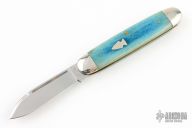 This slipjoint from Northwoods Knives features a satin finished blade with swedge and nail nick. The handle has nickel silver bolsters with blue camel bone covers and over brass liners and stainless steel spring. Includes a brown leather sheath. Has a few light scratches, otherwise excellent condition.