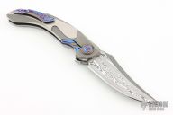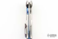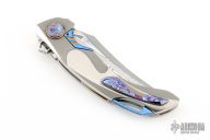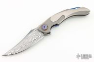 This Phoenix framelock flipper by Ron Best is amazing. It features a Damasteel blade with notched thumbrest and flipper. The handle has a two-tone titanium frame, anodized titanium pivot with zircuti inlays, zircuti tip up clip, anodized titanium backspacer, and an anodized titanium lockbar with stainless steel lockface insert. Inside of backspacer reads "Ronald Best #1 11/11/20" Nice detent, lockup and blade seating. Comes with hard case. Excellent condition.