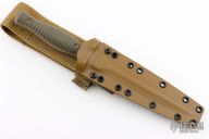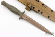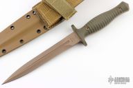 This V-14 Dagger by Spartan Blades is a Les George design, it features a flat dark earth double edged blade with fuller, .249" blade stock and .900" blade depth. Full tang construction with green G-10 scales. Comes with original sheath. Excellent condition.