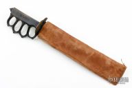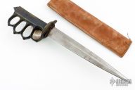 This is a trench knife has been given a new double edged blade. It has a cast Brass handle with U.S. 1918 stamped on one side. The blade is double edged and satin finished, .139" blade stock and 1.149" blade depth, hidden tang construction. Comes with a brown leather blade cover, I wouldn't consider it a sheath. Has some patina and scratches, otherwise good condition.