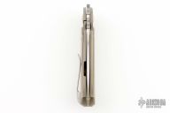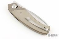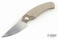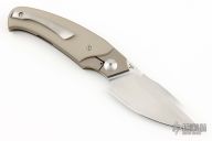 This Custom Front Flipper by David Lespect features a hand rub satin finished blade with swedge, notched thumbrest and front flipper. The handle has an anodized titanium frame, tan G-10 scales and backspacer, satin titanium tip up clip. Rides on bearings, nice detent, lockup and blade seating. Comes with a zippered case. Excellent Condition.