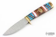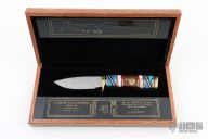 Beautiful fixed blade customized by David Yellowhorse. "Knapped" blade with brass guard and pommel. Brass "Cuthair Yellowhorse" inlay in ironwood. Spacers of turquoise, brass, black, pearl and red. Comes in original wooden display box with engraved plaque and original papers. Excellent condition. S/N 1226