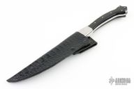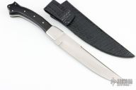 This Long Fighter by Larry C. Mensch features a hand rub satin finished blade with a false top edge, .202" blade stock and 1.375" blade depth, full tang construction. The handle has dovetailed stainless steel bolsters and black paper micarta scales. Comes with a black leather over kydex sheath, and a zippered case. Excellent condition.