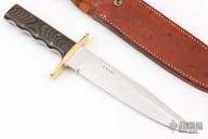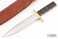 This fighter by Enedino De Leon features black linen micarta scales and white liners. Brass guard and pins. Satin finish blade with a sharpened top edge. Full tang construction with .256" blade stock and 1.326" blade depth. Includes a brown leather sheath. Has "WASIL" on the blade. Has a couple light scratches, otherwise excellent condition.