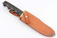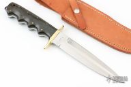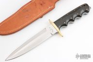 This SK2 Fighter by Enedino De Leon features a satin finish blade with a sharpened top edge, .195" blade stock and 1.277" blade depth, full tang construction. The handle has a brass guard, black canvas micarta scales with white liners. Includes a brown leather sheath. Excellent condition.