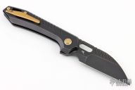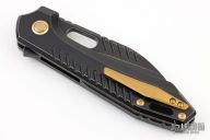 a. The dark version has stonewashed PVD black titanium coating both on the blade and on the handle, and it will be paired with a golden aluminum pivot collar and matching hardware (screws and pocket clips).