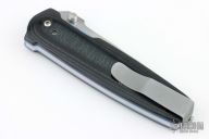This D/A linerlock by Butch Vallotton has a hidden push button under the rubber scale on the handle. Leaf spring action and smooth manual action. Satin finished blade and micarta handle scales with rubber inlays and titanium liners.  Bead Blast tip down steel pocket clip. Light blade play.  Has light scuffs otherwise the knife is in excellent condition.