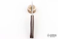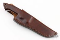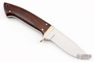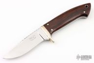 This knife by Glenn Marshall features a mirror polished blade with fileworked spine, .187" blade stock and 1.035" blade depth, full tapered tang construction. The handle has a nickel silver guard, ironwood scales with black liners, nickel silver pins, lanyard hole. The spine of the tang is fileworked. Comes with a brown leather sheath. Has a couple light scratches, otherwise excellent condition.