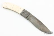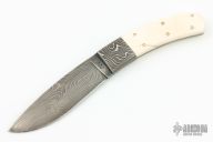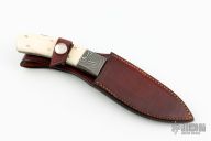This Hunter by Master Smith Steve Schwarzer features a Damascus blade with .165" blade stock and 1.209" blade depth, full tang construction. The handle has Damascus bolsters, mammoth ivory scales and nickel silver pins. Comes with a brown leather sheath. Has some cracks in the scales, otherwise good condition.