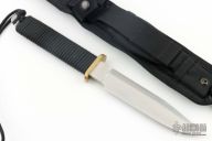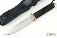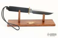 This EK Commando Knife has a clip point stainless steel blade with full tang and sharpened top edge. Blade width 3/16", depth 1-1/4". Handle is cord-wrapped with brass full guard and lanyard. Excellent condition. Comes with nylon sheath. Comes with a wooden display stand with SEAL Crest.